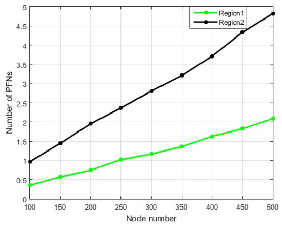 We established the knowledge about node density in PFZ1 and PFZ2 based on the theoretical analysis that we carried out with the volumetric information and then justified it by experimental results. By applying Equation (6), we calculated the volume for the upper cap of the hemisphere (PFZ1) using parameters h = 1000 m and r = 2000 m. Similarly, for the lower partial hemisphere, we used Equation (7), for the calculation of volume. Comparing the volumes, we found out that PFZ2 has more capacity than PFZ1, indicating that the probability of nodes is higher in PFZ2 as shown in Figure 4.