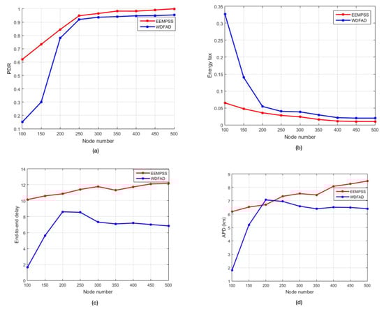 (a) PDR against the number of nodes; (b) energy tax versus the node count; (c) end-to-end delay against number of nodes; (d) APD compared to the node count. Comparison of ERPMSA-UWSN with WDFAD.