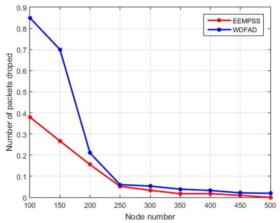 As shown in Figure 12a, the PDR increases with an increase in the number of nodes for both WDFAD-DBR and ERPMSA-UWSN. This is because the increase in the network density also increases the probability of active node occurrence, and reducing the void hole occurrence. ERPMSA-UWSN outclassed WDFAD in terms of PDR in both sparse as well as dense networks. WDFAD selects the next forwarding node based on the difference in weighting depth between the two hops. Alternatively, ERPMSA-UWSN selects the next forwarding node i.e., the master node based on the depth difference with higher energy and a greater number of PFNs. There are two types of holes in the network—, one is called void hole, while the other is referred to as energy hole. The void hole occurs due to the absence of PFNs in the forwarding area, while the energy hole exists due to the lack of sufficient transmission energy in the potential forwarding node, as shown in Figure 12. The difference of PDR between ERPMSA-UWSN and WDFAD decreases from sparse to dense networks due to the network density. Additionally, WDFAD drops the packet in the absence of PFN in its range i.e., void hole, but ERPMSA-UWSN keeps track of the void hole at the time of selecting the master node for transmission. Therefore, it rarely encounters void holes in its transmission period; however, sometimes there is a chance of an energy hole that occurs due to the additional use of the node. This is also resolved by adopting the 2nd or 3rd master in the region. In case, when the 2nd and 3rd master do not exist in the vicinity, we divide the PFZ into two portions, the lower PFZ2 portion which is denser in node population, and the upper PFZ1 which is mostly sparse. During the selection process, MSF filters out those masters whose PFZ1 has a minimum of 1 node, and if does not exist, a forwarding node from PFZ2 is selected. In a sparse network, WDFAD drops more packets which broaden the proportional gap between the plot of WDFAD and ERPMSA-UWSN, increases the probability of active nodes, and decreases the void holes, consequently decreases the packet drop as well as the gap in PDR results. To encounter the energy hole, our protocol provides additional support by suppressing redundant transmissions of the packet. This results in reducing the average energy consumption, which prolongs the node and network life, as a result of eliminating the energy holes.The void/energy holes and packet collision affect the network throughput and PDR. Like the WDFAD, we also use the two-hop mechanisms in our proposed protocol (ERPMSA-UWSN) to deal with the void holes. However, in ERPMSA-UWSN, it is ensured that the selected master has no void hole in its range. In addition, the problem of energy hole is significantly highlighted in ERPMSA-UWSN compared to WDFAD, as it mainly focuses on transmission energy economization. This is achieved by adapting distance-based transmission methods for packet transmission and selecting the best master for forwarding, whose responsibility is to keep the network free of energy holes. The collision of packets occurs whenever packet traffic is high since the ERPMSA-UWSN suppresses the redundant transmissions which leads the network to have low packet traffic and thus minimizes the collision of packets. For these reasons, the network throughput for our proposed protocol, in sparse as well as dense networks, is higher than the existing ones i.e., WDFAD-DBR whether sparse or dense networks. The slow growth noted in the dense network is justified because ERPMSA-UWSN has limited sources of data packet after suppressing the majority of the PFNs. In contrast to WDFAD, there are multiple packet resources in the network, which may cause a collision and cause packet loss in the network. In the case of a dense network, we produce more chance of finding the best master for the transmission, leading the network out of energy holes and void holes situations and preventing packet drop. This behavior of the PDR is well justified by the packet drop profile as shown in Figure 13. It can be seen that the amount of packet drop decreases with the increase in the number of nodes, and ERPMSA-UWSN shows less packet drop compared to WDFAD in both sparse as well as dense networks.