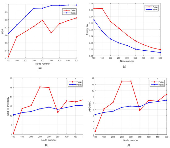 (a) PDR against the number of nodes; (b) energy tax in comparison to the number of nodes; (c) end-to-end delay against the number of nodes; (d) APD vs. number of nodes. Comparison of ERPMSA-UWSN for 7 and 9 sinks.