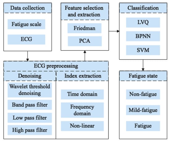 The research framework of this paper is displayed in Figure 1. To identify the fatigue state of pilots, ECG data and the Samn–Perelli 7-Level fatigue scale data are collected through flight simulation experiments. The obtained ECG data are preprocessed. Then, time domain, frequency domain, and the non-linear characteristic indexes of the ECG data are selected and extracted by the Friedman test and PCA. Based on the results of feature selection and extraction, the pilots’ fatigue state identification model is established by using the LVQ neural network. The pilot’s non-fatigue, mild fatigue, and fatigue states are identified. The identification results are compared with those of BPNN, SVM and other traditional methods.