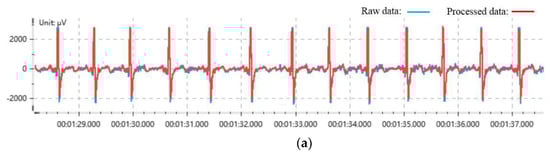 Wavelet threshold denoising can remove white noise []. We chose Daubechies-4 as the wavelet generating function, and the threshold selection is shown in Equation (1) []. After the ECG signal is decomposed by the wavelet threshold denoising, the wavelet coefficient of the effective signal is larger and that of the white noise is smaller []. Thus, we can remove the white noise. At the same time, motion artifacts can also be removed by wavelet threshold denoising [,]. The comparison of some ECG signal data before and after denoising is exhibited in Figure 2a.