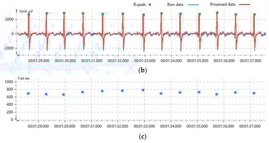 ECG Preprocessing. (a) ECG signal data before and after denoising. (b) The results of R-peaks extraction. (c) The results of RR intervals.