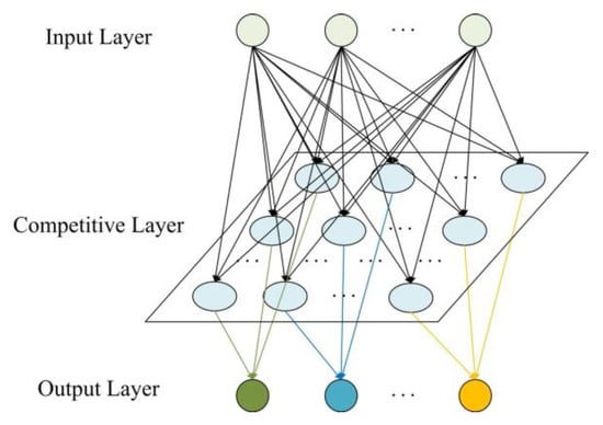 Learning vector quantization is a kind of forward and supervised neural network evolved from a competitive algorithm by Finnish scholar Kohonen []. The LVQ neural network consists of an input layer, competition layer, and output layer, as shown in Figure 3. The classification results can be obtained only through the internal interaction of the input layer, competitive layer, and output layer [,]. The LVQ neural network has better recognition and convergence characteristics for complex and scattered feature datasets.