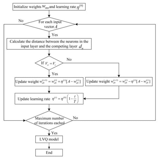 As shown in Figure 3, the connection mode between the input layer and competition layer is a full connection. The connection mode between the competition layer and linear output layer is a partial connection. When a vector is input into the network, the neuron in the competition layer closest to the input vector is activated to win the competition. At this time, the state is “1”, while the rest of the neurons in the competition layer are all “0”. The training steps of the LVQ are as show in Figure 4.