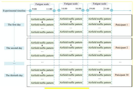 On the day before the experiment, the participants rested before 23:00 to ensure that they had 8 h of adequate sleep. In addition, they participated in the experiment from 9:00 to 11:00, 14:00 to 16:00, and 19:00 to 21:00 on the day of the experiment. Moreover, they were deprived of their right to sleep at noon on the experimental day. The experiment lasted for 30 days. One pilot participated in the experiment every day. The ECG data of the pilots were collected at 9:00–11:00, 14:00–16:00, and 19:00–21:00. This is about six hours a day. The experimental process is illustrated in Figure 8.