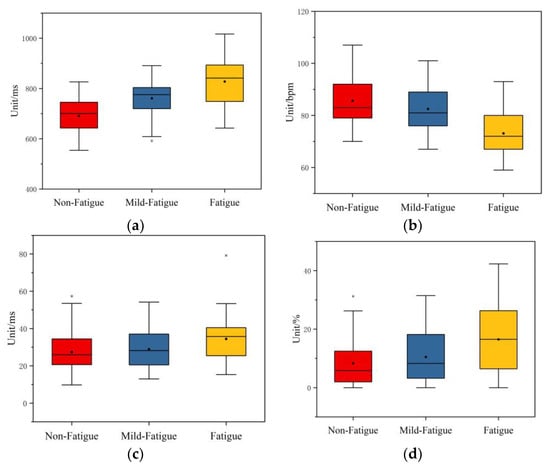 The boxplot of the time domain indexes selected by the Friedman test is shown in Figure 10. The maximum and minimum in the boxplot are the maximal non-abnormal value and the minimal non-abnormal value, respectively. The number of outliers is extremely small, and individual outliers do not affect the results. Therefore, detailed analysis of outliers was not performed [,]. The maximum, minimum, median, average, and upper/lower quartiles of AVNN increased by the increase in degree of fatigue. The maximum, minimum, median, average, and upper/lower quartiles of AVHR decreased with the increase in degree of fatigue. The minimum, median, average, and upper/lower quartile of RMSSD increase with the increase in degree of fatigue. The maximum, median, average, and upper/lower quartile of PNN50 increased with the increase in degree of fatigue. It can be seen that AVNN, RMSSD, and PNN50 have an obvious upward trend, while AVHR has a significant downward trend with the increase in degree of fatigue.