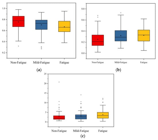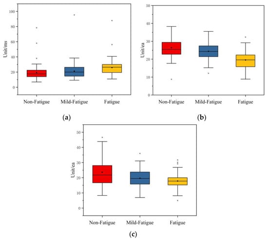 In order to test the normality of the indexes, the Kolmogorov–Smirnov test is adopted. All the indexes do not conform to the normal distribution. As a result, a non-parametric test method, namely, the Friedman test, is adopted. The Friedman test is a method that uses rank to judge whether there are significant differences in multiple overall distributions []. We use the Friedman test to select some indicators that have significant correlation in non-fatigue, mild fatigue, and fatigue states.