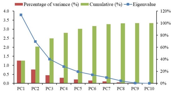 The number of principal components is selected according to the principle that the cumulative contribution rate of principal components reaches 85%. Principal component contribution rate and cumulative contribution rate are calculated by Equations (6) and (7). The value of factor load is calculated by Equation (8).
