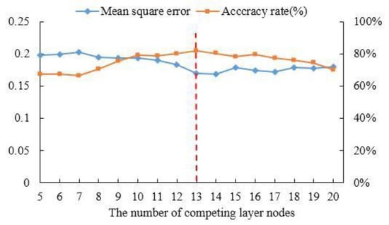 The number of neurons in the competitive layers has a great effect on the performance of the LVQ model. An excessive number of neurons in competitive layers will increase the complexity of the model and increase the training time. Too few neurons in the competition layer will make the model too simple and poor fitting. The mean square error (MSE) is chosen as the loss function. The smaller the value of MSE, the closer the model output distribution and the sample label distribution are. Here, K-fold cross validation (K = 10) is adopted to determine the best number of neurons in the competitive layer through a large number of experiments. The accuracy rate and MSE of pilots’ fatigue state identification based on the LVQ model are illustrated in Figure 14. When the number of neurons in the competitive layer is 13, the identification accuracy rate is the highest, and the MSE is relatively small, so the number of neurons in the competitive layer is 13.