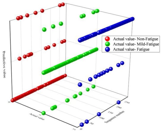 Based on the results of feature selection and extraction from the training set, AVNN, AVHR, RMSSD, PNN50, LFnorm, HFnorm, LF/HF, SD1, A++, and B++ were selected from the test set. After feature selection, the first five principal components were extracted from ten indexes in the test set. The first five principal components were input into the LVQ model to test the model. The pilots’ fatigue state identification results in the test set are revealed in Figure 15. In the figure, “0”, “1”, and “2” are, respectively, used to represent the non-fatigue, mild fatigue, and fatigue states. In the 96 test samples with a real label of non-fatigue state, 10 are identified as mild fatigue state, and seven are identified as fatigue state. In the 96 test samples with a real label of mild fatigue state, 13 are identified as non-fatigue state, and eight are identified as fatigue state. In the 96 test samples with a real label of fatigue state, four are identified as non-fatigue state, and 10 are identified as mild fatigue state. The identification accuracy rate of the pilots’ fatigue state is listed in Table 11. The average identification accuracy rate of the LVQ model is 81.94%, which can effectively identify the pilots’ non-fatigue, mild fatigue, and fatigue state.