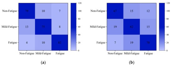 We randomly selected 22 participants and used the data of these 22 participants as the training set. The data from the remaining 8 participants were used as the test set. The training set contains 1152 samples, and the sample size of each time period in the training set is 384. The test set contains 288 samples, and the sample size of each time period in the test set is 96. The proportion of non-fatigue, mild fatigue, and fatigue samples in the training set and test set is 1:1:1. We selected and extracted the features from the training set to establish the pilots’ fatigue identification model.