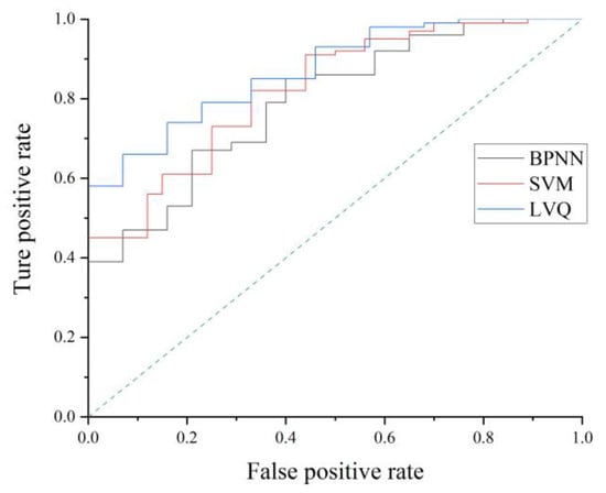 The ROC curve is a comprehensive indicator, which reflects the continuous variables of sensitivity and specificity. The receiver operating characteristics curves of the LVQ, BPNN, and SVM models are described in Figure 17. Three curves are located at the top left of the 45° diagonal and deviate from the 45° diagonal. Three models have good recognition performance. The curve of the LVQ model is closer to (0,1) point than that of the SVM model and BPNN model, which indicates that the performance of the LVQ model is better.