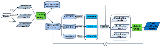 In the proposed method, motivated by the above viewpoints, we combine the deep learning technique with the traditional classifiers, the aim of which is to take advantage of each classifier and improve the overall accuracy (OA) of classification, even in the case of limited training samples. Firstly, the classification results of the Wishart classifier, SVM classifier, and CV-CNN model are used to conduct majority voting. By doing so, the labeled training samples are expanded by dividing the classification result into a strong dataset and a weak dataset. The strong dataset are used as pseudo-labels to reclassify the weak dataset by CV-CNN. In order to make full use of the strong dataset, the weak dataset is reclassified three times using the pseudo-labels derived by the strong dataset, and then followed by a majority voting manner to integrate the three classification results.