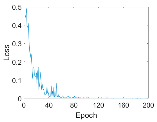 In this experiment, we randomly selected only 509 labeled samples. That is to say, only 39 pixels were taken as the training samples for each class. The training sample ratio was only 0.34%, which is quite a low level when compared with other studies. The classification results are shown in Figure 3 and the quantitative assessment results are listed in Table 2. For the first CV-CNN experiment on Flevoland dataset, the hyperparameters were set as follows. The learning rate was 0.6, and the batch size was 10 with 200 epochs. The loss curves are shown in Figure 4. From the loss curves, we can easily find that with the increasing of epoch, the loss decreased quickly. When the epoch is 100, the loss was stable at 0.006.