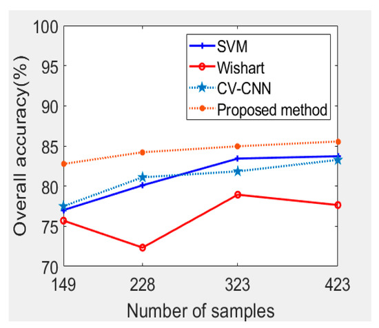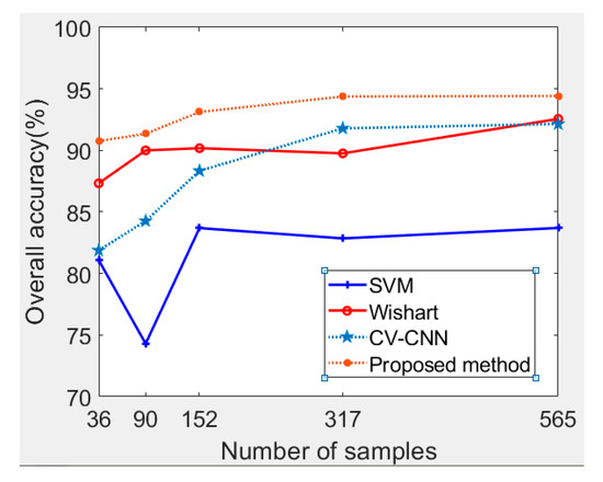 To further analyze the improvement of the proposed method, a series of experiments were conducted. For the Flevoland dataset, the trends of accuracy with the increase of the training samples are shown in Figure 6. It can be seen that, with the increase in the number of training samples, the OA of each method generally increased. The superiority of the proposed method was more significant when the number of samples was small, especially when compared with CV-CNN. The accuracy of SVM was relatively poor, and its accuracy fluctuates with the increase of the samples. With 90 training samples in particular, the classification accuracy was only 74.3%. In general, the Wishart classifier was stable with different numbers of samples, and the OA is around 88.0%.