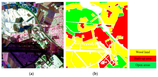 The second experiment was carried out with the dataset obtained over the German Aerospace Center at Oberpfaffenhofen in Germany. This image was acquired by the ESAR system. The Oberpfaffenhofen image, as a benchmark dataset, is widely used for PolSAR data classification research. According to the ground truth shown in Figure 7, there are three identified classes in the image, i.e., built-up areas, wood land, and open areas. The size of the image is 1300 × 1200.