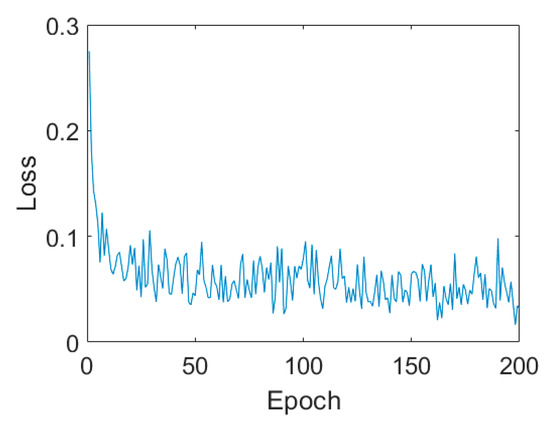 In this experiment, we selected only 446 labeled samples; in other words, only 149 pixels were taken as the training samples for each class. The training sample ratio was only 0.18%, which is quite a low ratio. For the first CV-CNN experiment, on Oberpfaffenhofen dataset, the hyperparameters were set as follows. The learning rate was 0.8, and the batch size was 10 with 200 epochs. The loss curves are shown in Figure 8. With the increasing of epoch, the loss fluctuated, but the tendency decreased.