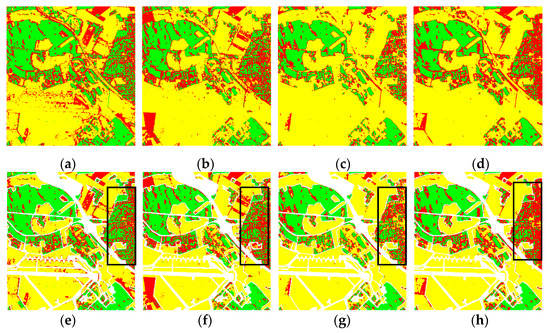 Classification results for the Oberpfaffenhofen dataset. (a–d) Classification results of the different approaches: (a) Wishart, (b) SVM, (c) CV-CNN, (d) proposed method. (e–h) Results overlaid with the ground-truth maps of (a–d), respectively.