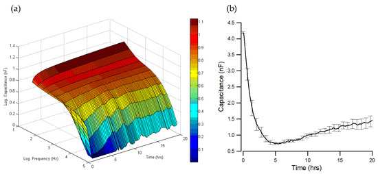 Time-series capacitance measurement of hMSC attachment and spreading. Cells were plated into an ECIS well at time zero, and the seeding density is about 40,000 cells per cm2. (a) A three-dimensional plot representing the measured time-dependent and frequency-dependent capacitances during the attachment and spreading of hMSCs. (b) Time-dependent changes in measured capacitance at 64 kHz during the attachment and spreading of hMSCs. Data obtained from eight working electrodes were averaged and represented as the mean ± standard error of the mean.