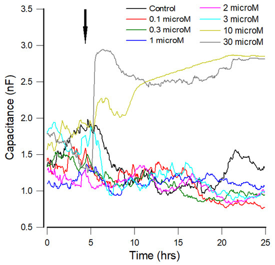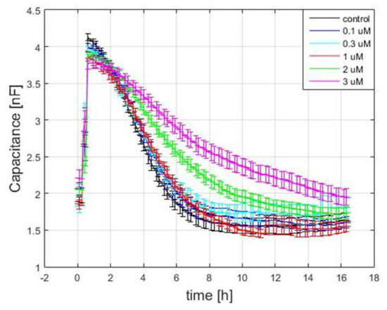 Here, a single open electrode had a capacitance at 64 kHz of about 4.2 nF (Copen), as shown at hour 0 in Figure 2b. This was the approximate capacitance value for all the working electrodes before cells were seeded into electrode wells. With a confluent layer of hMSCs in place, this value reduced to ~1.4 nF (Cconfluent). The fractional area of the electrode covered with the cell population can be estimated by (Copen − Ccells)/(Copen − Cconfluent) [14,15]. Both 10 and 30 μM data (yellow and gray curves in Figure 3) stabilized at ~2.8 nF after 20 h FCCP treatment. The fractional area covered with cells was calculated as (4.2 − 2.8)/(4.2 − 1.4) = 50%, suggesting that high-frequency capacitance measurement can be used to sensitively monitor high concentration FCCP-induced changes in cell morphology.