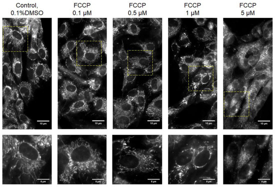 Fluorescence microscopy images of mitochondria from cultured hMSCs, which were under the challenge of various concentrations of FCCP for 20 h and labeled with MitoTracker™ Deep Red FM. Images of the lower panel are enlargements of the areas boxed in the images of the upper panel. Mitochondrial fragmentation was clearly seen for cells treated with 5 μM FCCP.