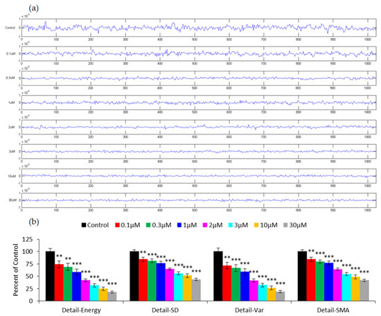(a) Amplitudes of DWT detail coefficients at Level 1 obtained from the time-series capacitance data presented in Figure 5a. Concentrations of FCCP, from top to bottom, are control, 0.1, 0.3, 1, 2, 3, 10, and 30 μM. (b) Detail-Energy, Detail-SD, Detail-VAR, and Detail-SMA (signal magnitude area) values of the detail coefficients at Level 1. For each concentration, at least eight replicate wells from four independent experiments were carried out (n = 8). The results are expressed as the percentage of control. Values shown are the mean ± standard error of the mean. ** p < 0.01, *** p < 0.001.