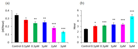 (a) Hill slope and (b) T50 values calculated from the high-frequency capacitance tracings shown in Figure 7. Values shown are the mean ± standard error of the mean. The statistical significance was calculated by comparing each concentration group with the DMSO control. * p < 0.05, ** p < 0.01, *** p < 0.001.