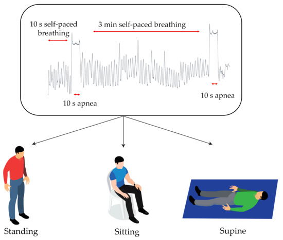 Firstly, each volunteer was asked to wear the reference instrument belt on the xiphoid process line and the 2 elastic belts (one on the nipple line and one on the umbilical line). Both systems were worn in direct contact with the skin. The electronic board was positioned on the left side of the upper belt (next to the heart), in order to retrieve the cardiac activity displacements on the chest wall. Then, the volunteer was asked to perform approximately 10 s of self-paced breathing, a0 s apnea at the end of the inspiratory phase, 3 min of self-paced breathing and finally a 10 s apnea at the end of the inspiratory phase. The same protocol was applied in 3 different positions (i.e., standing, sitting and supine) for a total of 24 trials. The 9-axes M-IMU and the output of the 4 Wheatstone bridges along with the reference system parameters were collected simultaneously.