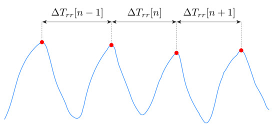 Figure 3. A schematic representation of the breathing act period . The blue line represents , and the red circles represent the identified respiratory peaks. - The third step was devoted to computing the RR for the n-th breath as , for () and ().