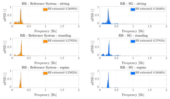 The frequency domain analysis allowed us to estimate the average RR during the entire duration for each volunteer in each scenario (i.e., standing, sitting and supine). An example of a signal spectrum for a representative subject is presented in Figure 4 which shows the normalized PSD (nPSD), computed by dividing the amplitude of the spectrum by its maximum peak value, of both the reference system and the WS in all scenarios.