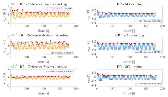 To assess RR we considered the signals recorded by the conductive sensors, which followed the breathing-related motions of the subjects’ rib cages (see Section 3.1). Specifically, we considered the average in time of the sensors of the four recorded conductive signals, hereinafter denoted as . Both the conductive signal and reference signal () were filtered using a third-order Butterworth band-pass filter between 0.05 Hz and 2 Hz using zero-phase digital filtering implemented through the function "filtfilt" (embedded in MATLAB®). We selected 0.05 Hz as the low cut-off frequency in order to discard very slow signal variations from the recorded data; conversely, we selected 2 Hz as the high cut-off frequency, since RR is hardly above 1.5 Hz [9]. The choice of filtering the RR signals within the mentioned frequency band (i.e., from 0.05 to 2 Hz) agrees with the results reported in [27]. We aimed to filter out components not relevant for our applications while avoiding discarding any useful information recorded by the sensors [9,39].