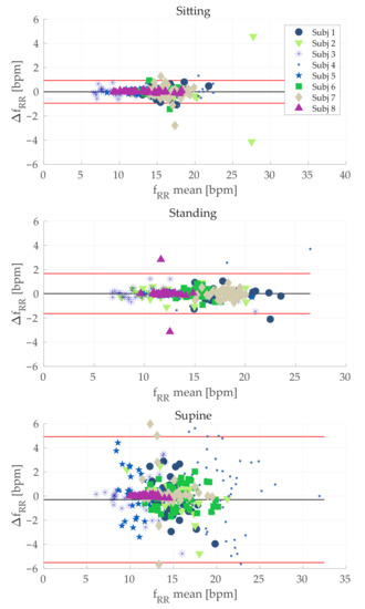 Concerning the breathing activity, we monitored both average RR, by means of a frequency domain analysis (Section 5.1.1), and RR breath-by-breath, through a time domain analysis (Section 5.1.2). In both cases we considered band-pass filtered using a zero phase shift filter and we compared the estimated RR with the one estimated by the reference system (). According to Section 6.1.1, the average RR estimated by the proposed WS can be considered as reliable, since the errors obtained were, on average, fractions of the breath-per-minute in sitting and standing tasks. The average error was ~3 bpm when considering the supine task, which corresponds to an average percentage error of ~9%. Such results were confirmed in the time domain analysis (Section 6.1.2). Indeed, the obtained for sitting and standing are fractions of the breaths per minute. Additionally, in the worst case scenario (represented by the supine task) acceptable errors were obtained (~1.5 bpm, corresponding to a of ~9.5%). The same behavior was obtained considering Bland–Altman analysis (see Table 6 and Figure 6). Although the MOD value was acceptable in all the cases, the LOAs were high especially for the supine position. A possible explanation for the worse results obtained during supine task may lie in an undesired interaction between the elastic bands with the support used let subjects lay down. Probably, in this configuration the elastic band stretched, thereby worsening the signals recorded by conductive sensors. The use of bands with the rear part being stiff instead of being elastic might solve this issue. However, this is just a speculation and future investigations will be devoted to study such aspects.