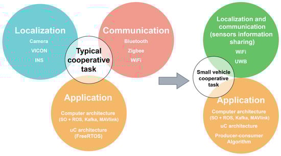 The use of an operating system has made it possible to standardize the technologies for the problem of cooperativity between several robots or vehicles. To this end, the devices, the sensors, the communication modules, the protocols, and the programming languages are designed to be compatible with each other. This conception of unified platforms such as ROS, Kafka, AEROSTACK, MAVLink among others, resolves several hardware problems and allows a more user-friendly environment for software developers [1,2,3,4]. However, high compatibility leads to a significant increase in resource usage. Another consequence is to lose the diversity of solutions that are the result of particular case investigations.