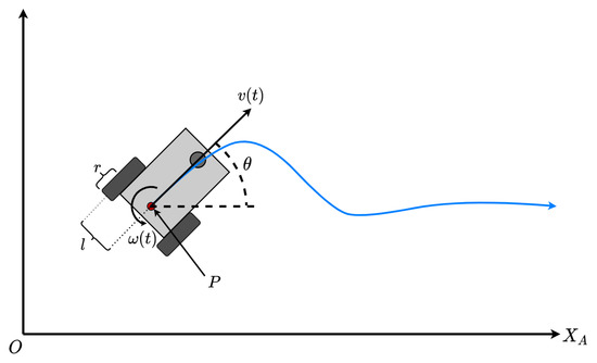We used a robot as a mobile reference point within the workspace. The robot with 3-DOF is of a differential configuration, so it has two independent, active wheels and a fixed wheel as a support point. The odometry of the vehicle uses encoders and a gyroscope as a relative reference system. The vehicle’s operation is executed intrinsically in the controller using the dynamic model proposed in [47].