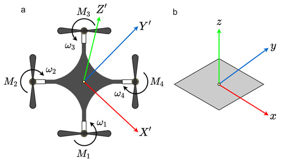 Nano-quadcopter. (a) Body frame. (b) Inertial frame.