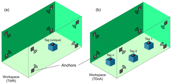 Different configurations of the absolute positioning system mounted within a workspace: (a) existence of only one tag: a location algorithm based on “two way ranging” TWR is used. (b)Two or more tags are present: a location algorithm based on “time difference of arrival” TDoA is used.