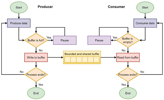 Collaboration in navigation among autonomous robots represents a problem of synchronization between the transmission and reception of positioning and movement data. In this problem, there appear two parallel processes (producer and consumer), which exchange information by a finite memory buffer [52]. Here the producer is in charge of generating and inserting data into the buffer, trying not to saturate it. Otherwise, the consumer extracts the data from the buffer one by one, preventing the buffer from emptying. Applications of this problem are commonly in concurrency, and message passing, although trivial, is extremely useful when needed [53]. Figure 5 shows the flowchart of the consumer–producer problem.
