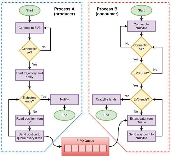 Flowchart of the process A (producer) implemented for the mobile robot EV3 and of the process B (consumer) implemented for the Crazyflie quadcopter.