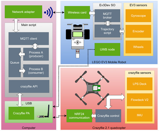 The details about the algorithm’s implementation can be viewed in the block diagram in Figure 8. It illustrates the relationship of the tools used between the computer, the EV3 robot and the Crazyflie quadcopter during the algorithm’s execution. The white arrows indicate the internal communication flow, while the dotted arrows represent external communication flow.
