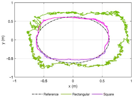 This experiment aimed to characterize the absolute positioning system and, after that, estimate the tracking accuracy in 2D and 3D. The system was placed within a controlled environment, and functionality tests were carried out within the fixed position’s polygon, defined by the anchors. The 2D tracking tests consisted of following prior defined trajectories using the ground vehicle. The corresponding robot was tagged to know in real-time its position in the plane, left side of Figure 6. In the space, we used a nano quadcopter with a tag integrated, as shown on the right side of Figure 6. The data obtained was used to reconstruct the trajectory and to know the accuracy of the system.