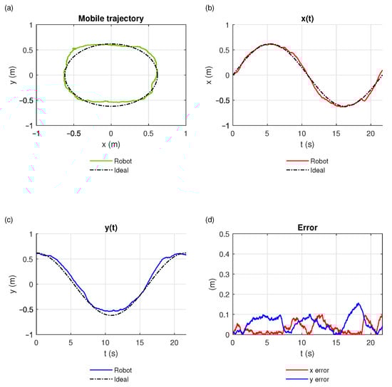 Results of the characterization run for a 2 × 2 m workspace. (a) Trajectory performed by the robot. (b) x-axis component of the movement. (c) y-axis component of the movement. (d) Quadratic error on x and y between the performed path and the given ideal trajectory.