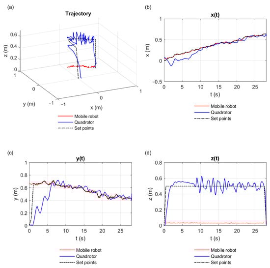 The producer-consumer algorithm always kept the equilibrium of data. For this reason, the Crazyflie quadcopter intercepted the EV3 robot with acceptable performance. Figure 11 illustrates the best result we obtained when executing the algorithm; that is, it represents the sequence of the points that were stored in ’s queue, coming from the EV3 robot, which was later on converted into set points for the Crazyflie quadcopter. Figure 11a shows the trajectories performed by the EV3 robot (red line) and by the Crazyflie quadcopter (blue line) in 3D perspective. The ideal trajectory for the quadcopter is shown by the black dashed line. The projections of the trajectories on the x, y, and z axes are similarly represented in Figure 11b–d.