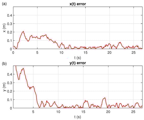 Figure 12 shown the RMS-positioning-error of the EV3 robot and the Crazyflie quadcopter from the ideal path. We restricted the evaluation of the EV3 robot’s performance to the -plane. In Figure 12a, it is seen that the RMS-error in x is always smaller than 0.22 m. When s the error is greater than 0.1 m, for 10 s 19 s you get an average RMS-error of 0.04 m, and in the interval of 19 s 23 s the RMS-error is greater than 0.04 m but always less than 0.1 m, due to the proximity to the anchor three.