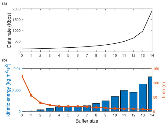 Buffer size vs. (a) consumption data rate and (b) kinetic energy and execution time comparison as a system’s performance evaluation.
