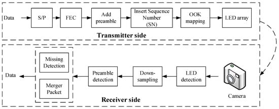 The sequence number (SN), which helps the receiver side combat the frame rate variation effect, is inserted into each packet after the preamble. It helps to remove the redundant packets in case of oversampling. Next, the large package will be merged from adjacent images. The SN also enables the cameras in the receiver sides to detect the missing packet in case of undersampling. The advantages of the SN are presented in Section 4.