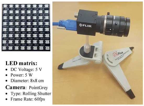 We implemented the proposed system using a Point Grey camera with rolling shutter mode on the receiver side and a LED matrix (5-V, LED matrix 8 × 8, 8 × 8 cm2 rectangle) on the transmitter side shown in Figure 5. Moreover, we determined the performance of the proposed system by controlling the various values of camera exposure time (100–750 µs) at different communication distances.