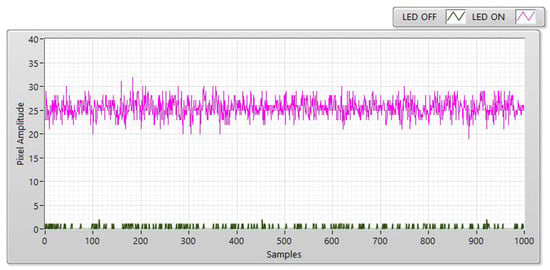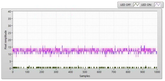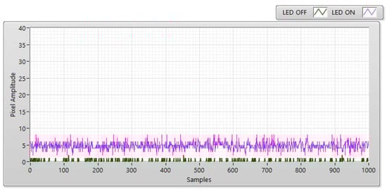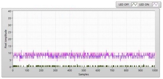 Because of the difference between camera types on the market, each camera should indicate its evaluation. For instance, a theoretical estimation of pixel SNR is illustrated in Figure 4 as a nonlinear curve that used Equation (2). The shutter speed of a rolling shutter camera is estimated to be 10 kHz.
