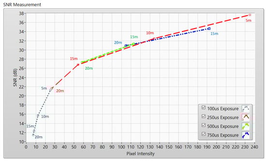 In Equation (3), A is the measurement of the LED’s signal power, B is the measurement of the background noise, and n is the number of measured samples. For example, Figure 6, Figure 7, Figure 8 and Figure 9 shown that: the LED’s signal power is displayed in the pink line, and the background noise is displayed in the green color line with different communication distances. The received pixel amplitude value varies inversely with the distance, i.e., it is smaller at longer distances. The SNR calculation is also affected by the shuttle speed and exposure time, as illustrated in Figure 10. In this scenario, the operation of an image sensor is similar to that of a low-pass filter, which smooths the high-tone signal with an increase in the exposure time. Similarly, the communication bandwidth decreases, leading to the smaller noise power spread over the bandwidth when the exposure time increases. Based on Equation (3), the SNR will increase with a longer exposure time because of decreased noise power. We also examined the relationship between the SNR and communication distance (Figure 10). As the distance increases, the SNR value decreases because of the smaller light sources received by the image sensors.