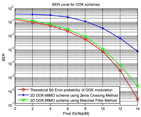 where is the level of the th OOK symbol and ∈ {0,1}. We assumed that the probabilities of bit 0 and 1 are and , respectively, is rectangular function; and is the symbol duration. Because of only additive white Gaussian noise (AWGN) in the channel model, the BER can be presented [] in Equation (5).